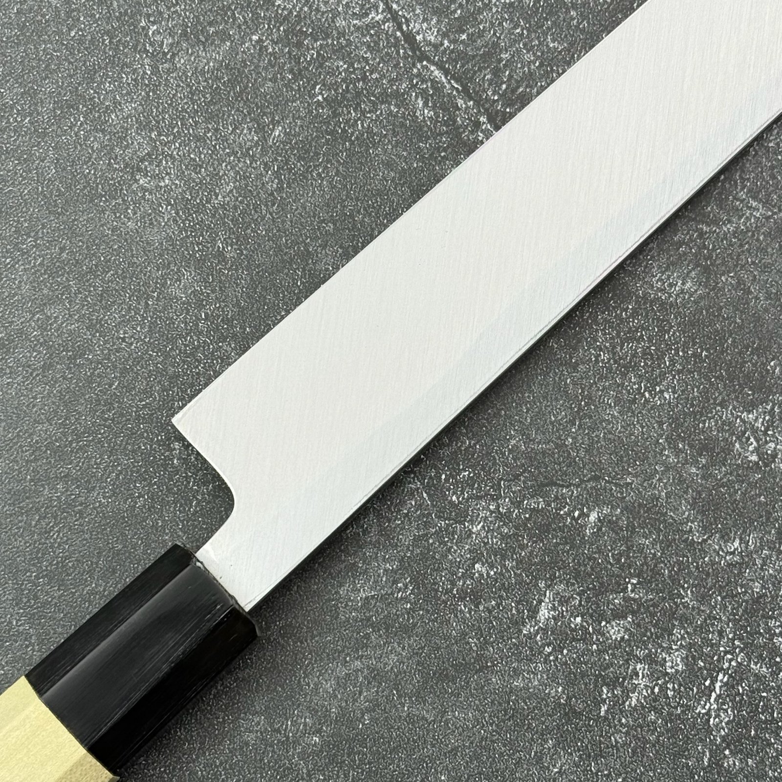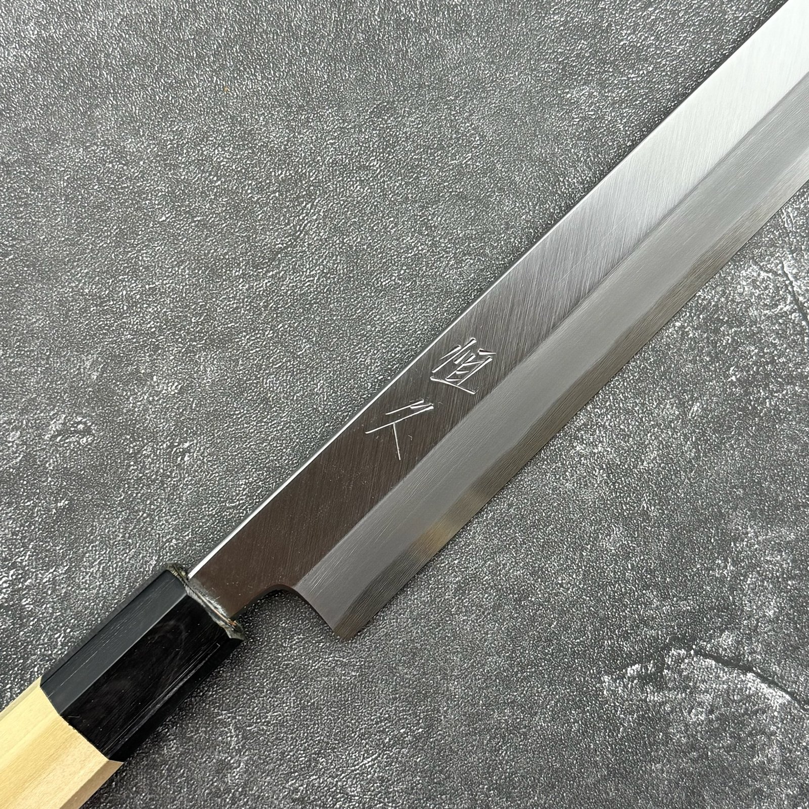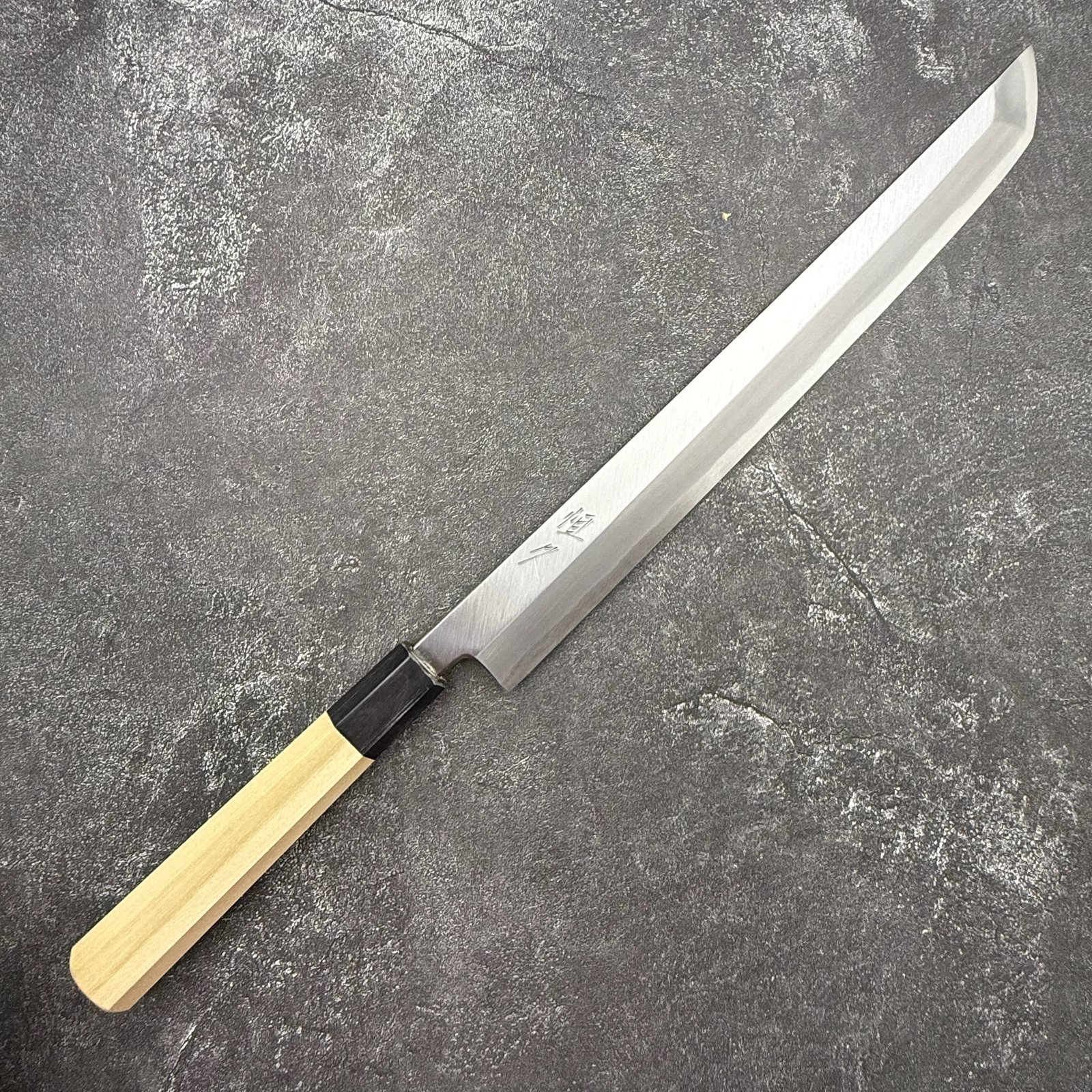 This Tsunehisa White #2 Sakimaru Takohiki is crafted in the traditional Kansai style, specifically designed for slicing sashimi and delicate cuts. Featuring a high-hardness White #2 carbon steel core, it delivers exceptional sharpness and clean cuts. The classic sakimaru tip enhances precision and control, making it ideal for professional chefs seeking accuracy in Japanese cuisine.